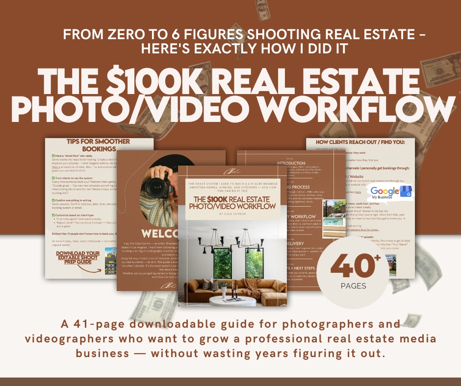 The exact system I used to grow a 6-figure real estate photo/video business — from gear and shot lists to booking, pricing, and delivery. Includes email templates, client docs, editing tips, and more. Whether you’re new or scaling, this 40+ page guide gives you the workflow to get paid, get faster, and get booked.